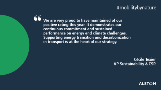 „Wir sind sehr stolz darauf, unsere positive Bewertung in diesem Jahr beibehalten zu haben. Sie zeigt unser kontinuierliches Engagement und unseren nachhaltigen Erfolg bei der Bewältigung von Energie- und Klimaherausforderungen. Die Unterstützung der Energiewende und der Dekarboni-sierung im Verkehrswesen steht im Mittelpunkt unserer neuen Strategie „Alstom in Motion”, sagte Cecile Texier, Alstoms Vizepräsidentin für Nachhaltigkeit und CSR.