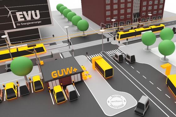 Eine Besonderheit des GUW+* ist der integrierte Batteriespeicher: Er gewinnt Bremsenergie der Stadtbahnen zurück und gleicht Lastspitzen aus. Zudem lassen sich mit diesem Speicher auch Systemdienstleistungen für das Energieversorgungsnetz, wie z.B. der Ausgleich kurzfristiger Belastungsschwankungen im Verbundnetz, erbringen. Langfristig soll dieser Speicher aus gebrauchten Busbatterien bestehen.