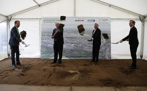 Wenn ein Staatssekretär des hessischen Ministeriums für Wirtschaft, Energie, Verkehr und Wohnen beim Bau einer Tankstelle persönlich Hand anlegt, dann muss es sich um ein Projekt der besonderen Art handeln. Tatsächlich ist die Tankstelle, die in den nächsten Monaten im Industriepark Höchst entstehen wird, alles andere als gewöhnlich: Es handelt sich um die erste Wasserstoff-Tankstelle für Passagierzüge in Hessen, an der ab Dezember 2022 die weltweit größte Brennstoffzellenzug-Flotte im Personenverkehr mit Wasserstoff versorgt werden soll. Den Startschuss für dieses Projekt hat Staatssekretär Jens Deutschendorf am Montag, 26. Oktober, gemeinsam mit RMV-Geschäftsführer Prof. Knut Ringat, Dr. Jörg Nikutta, Geschäftsführer Alstom Deutschland und Österreich sowie Dr. Joachim Kreysing, Geschäftsführer der Industriepark-Betreibergesellschaft Infraserv Höchst gegeben. Alstom liefert die Brennstoffzellenzüge, die der RMV einsetzen wird, die Industriepark-Betreibergesellschaft Infraserv Höchst errichtet und betreibt die Tankstelle.
