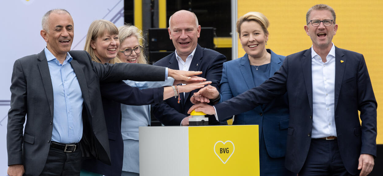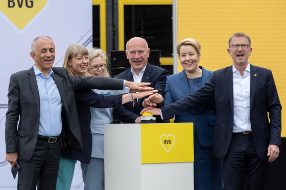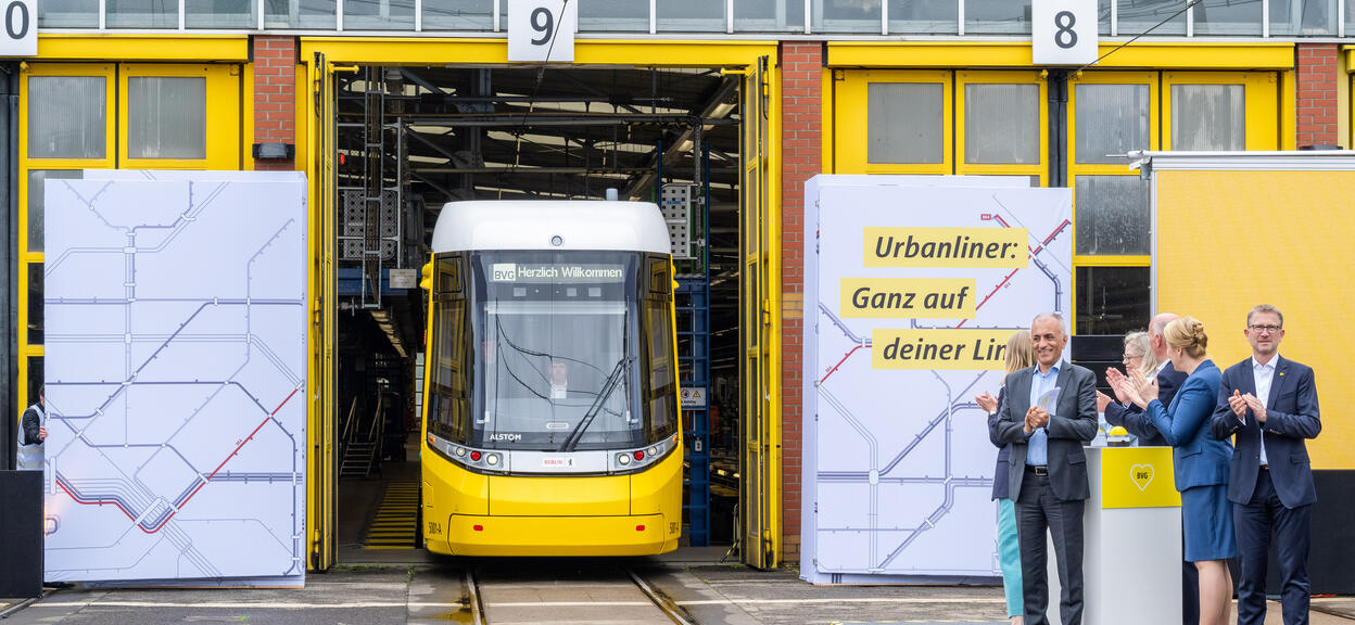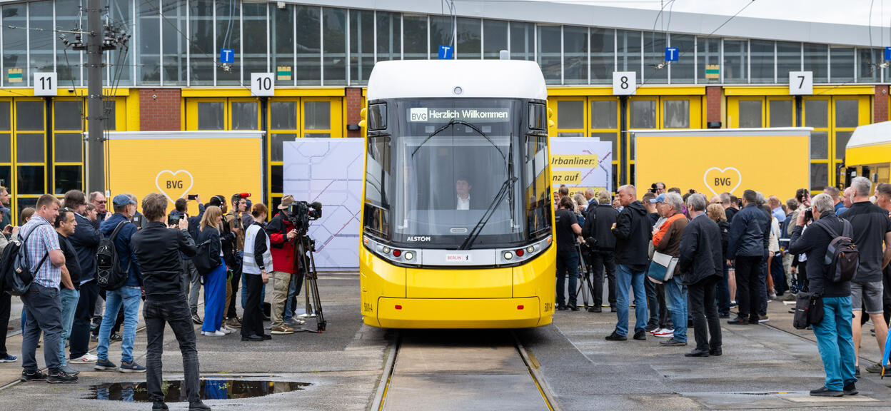 Heute stellte die BVG das erste Fahrzeug der neuen Generation auf dem Betriebshof Lichtenberg vor. BVG-Betriebsvorstand Dr. Rolf Erfurt und Straßenbahn Bereichsleiter Rico Gast nahmen es von Müslüm Yakisan, Regionalpräsident für die DACH-Region beim Hersteller Alstom, entgegen. Und weil neue Schienenfahrzeuge immer etwas ganz Besonderes sind, kamen zur Premiere auch der Regierende Bürgermeister Kai Wegner, die Wirtschaftssenatorin und BVG-Aufsichtsratsvorsitzende Franziska Giffey und Verkehrssenatorin Ute Bonde.