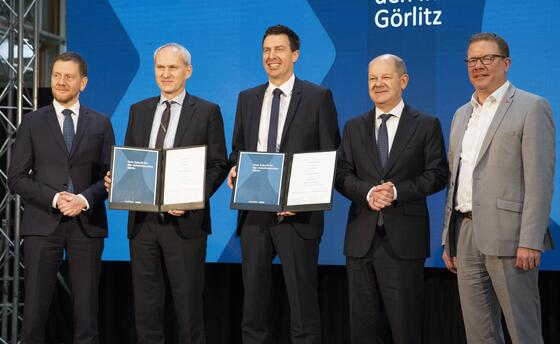 Präsentation der Rahmenvereinbarung zur Übernahme des Standorts Görlitz durch KNDS mit Bundeskanzler Olaf Scholz und dem sächsischen Ministerpräsidenten Michael Kretschmer.
