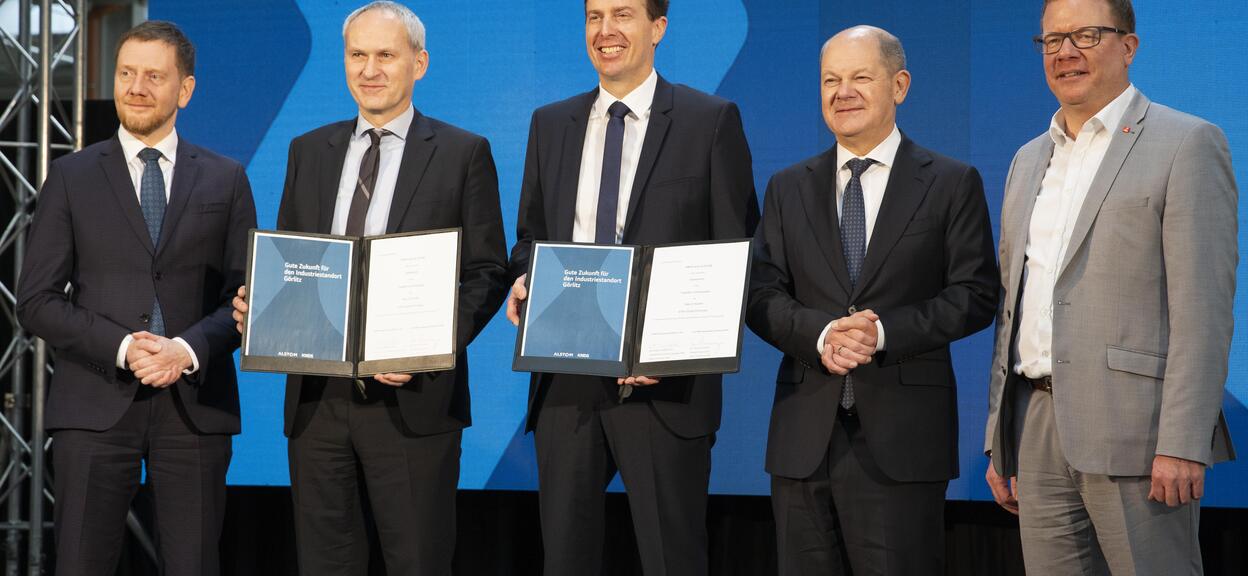 5. Februar 2025 – Die Verhandlungen zwischen Alstom und KNDS Deutschland GmbH & Co. KG (KNDS) über den Standort Görlitz haben eine weitere wichtige Hürde genommen. Beide Seiten unterzeichneten am 05.02.2025 eine Rahmenvereinbarung über die Übernahme des Standorts durch KNDS. Im Beisein von Bundeskanzler Olaf Scholz und des Sächsischen Ministerpräsidenten Michael Kretschmer informierten die Unternehmen am selben Tag in Görlitz über die Inhalte und Hintergründe der Vereinbarung.
