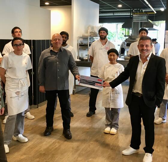 Remise du don par Alexandre Bouyon, Marketing Development Manager Alstom à Thierry Marx et les équipes de l'école Cuisine Mode d’Emploi(s)