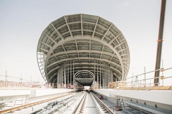 Activités d'infrastructure menées par Alstom près de l'une des nouvelles gares du projet de métro Route 2020, Dubaï, Emirats Arabes Unis.
