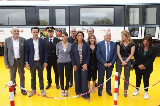 Les officiels accueillent la première rame du nouveau métro marseillais au dépôt de La Rose ce 28 juillet