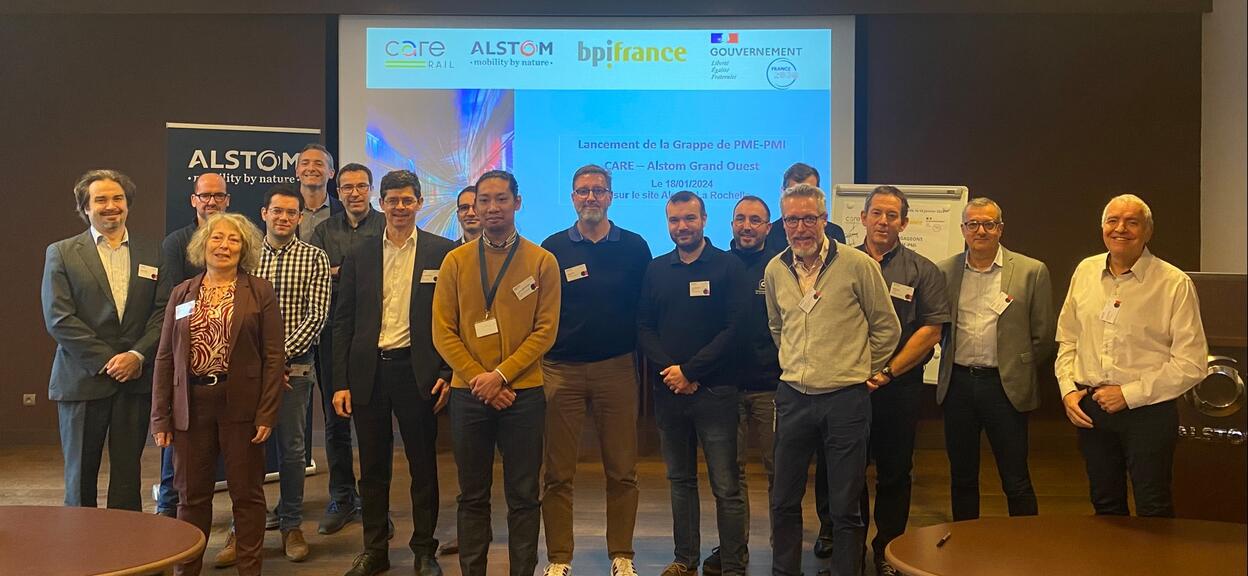 A La Rochelle, les représentants d’Alstom, de CARE et de Bpifrance entourent les représentants des PME situées dans le Grand Ouest, qui font partie de la 4e « grappe » nationale du programme CARE (© CARE/Alstom)