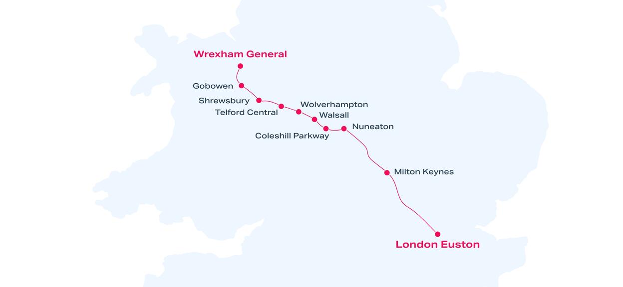 L’offre prévoit un service de cinq trains par jour dans chaque direction du lundi au samedi, et de quatre trains dans les deux sens le dimanche. Les trains s'arrêteront à Gobowen, Shrewsbury, Telford Central, Wolverhampton, Darlaston, Walsall, Coleshill Parkway, Nuneaton et Milton Keynes sur leur trajet entre Wrexham General et Londres Euston.