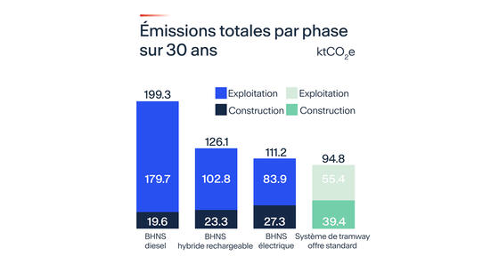 JC: Sur le plan environnemental, le tramway présente un avantage clair. Même un système BHNS entièrement électrique génère jusqu’à 17 % d’émissions de CO₂ supplémentaires sur l’ensemble de son cycle de vie par rapport à un tramway. Cette différence s’explique par le volume de véhicules nécessaire : pour offrir la même capacité que 20 tramways, un parc de bus beaucoup plus important est requis, entraînant jusqu’à 3,6 fois plus de kilomètres parcourus chaque année.