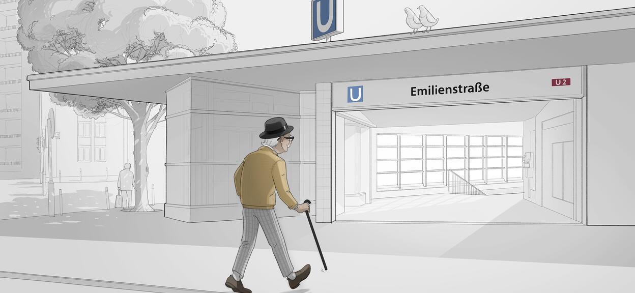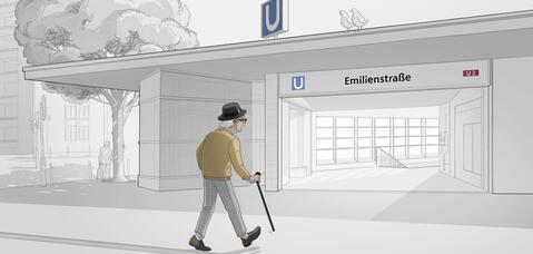 Il aperçoit les portes rouges du U-Bahn à l'approche de la Emilienstrasse. Volker s'installe au milieu du quai - il sait qu'il n'a pas besoin d'emprunter de marches pour monter dans les voitures du milieu. Le train s'arrête. Les larges portes d'entrée s'ouvrent. Volker monte facilement à bord. Il n'a pas besoin de les utiliser après tant de voyages, mais de la signalétique à bord du train indique clairement aux passagers la zone réservée aux personnes à mobilité réduite. Il trouve rapidement son siège habituel et confortable.