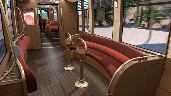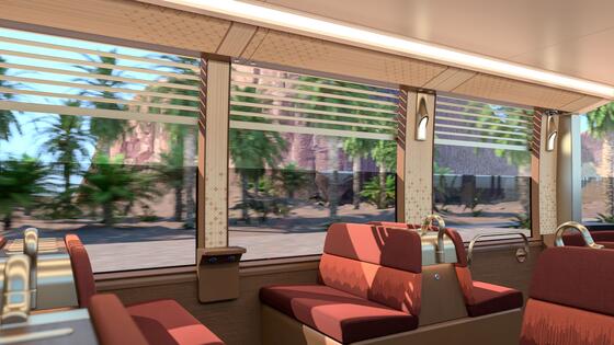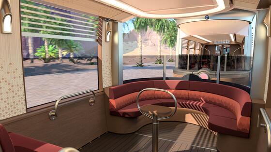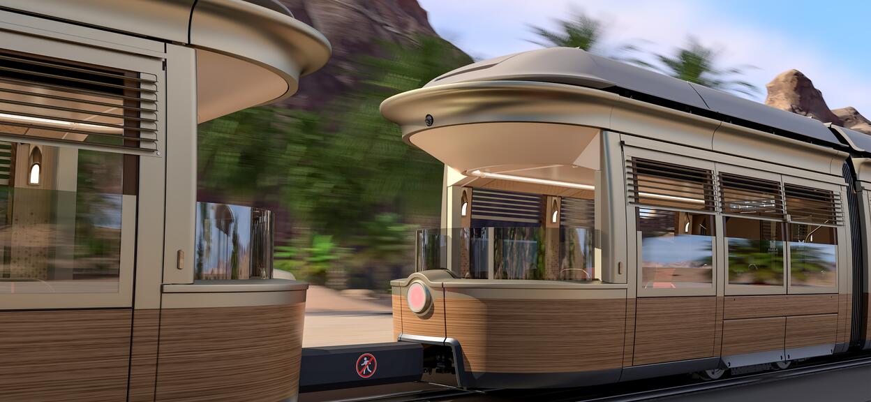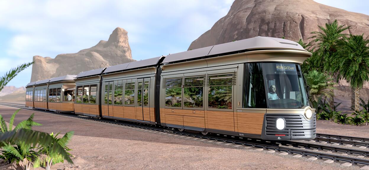 We’ve worked closely with the Royal Commission for AlUla (RCU), to develop a stunning design, even though we really had to step out of our comfort zone to get there. Initially, RCU envisioned a design with elevated carriages, resembling a wagon more than a tram. Through collaboration between the customer, Madrasat Aldeera and Alstom, the design evolved into tramway system that would blend seamlessly with its surroundings. Our initial design proposals drew inspiration from AlUla's rock formations, with mirrored segments referencing the Maraya cultural venue. The colours of the final product reflect AlUla's natural environment, incorporating shades of green to represent the region's river valleys. The tram also features a lovely ‘Belvedere’ outdoor seating area at the back.