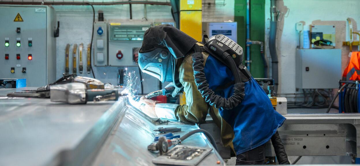 A welder works on the Avelia Horizon production line at Alstom’s La Rochelle site (©Alstom SA 2024/Julien Goldstein)